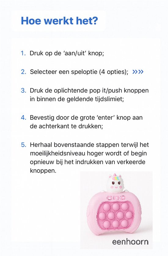Maak kennis met het vrolijke Drukknoppen Spel Eenhoorn – hét interactieve speelgoed dat kinderen eindeloos laat spelen, ontdekken en plezier laten beleven! Dit schattige eenhoornvormige toestel combineert de populaire pop-it bubbelervaring met licht- en geluidseffecten voor extra speelplezier.